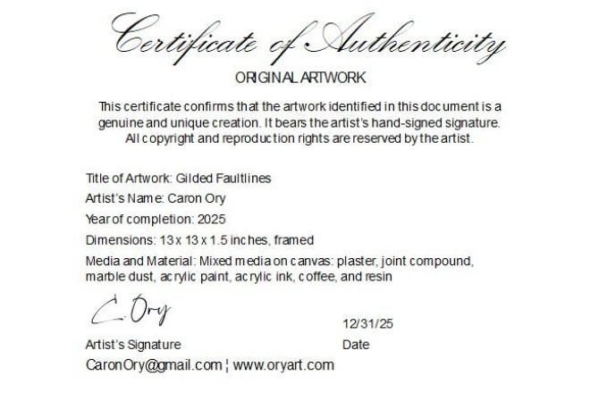 Description: This piece was created on stretched canvas using plaster, joint compound, marble dust, acrylic paint, acrylic ink, coffee, and resin. The black frame is Renewal Core, an environmentally sustainable recycled material. Each piece is signed and dated by Caron, and includes a certificate of authenticity.